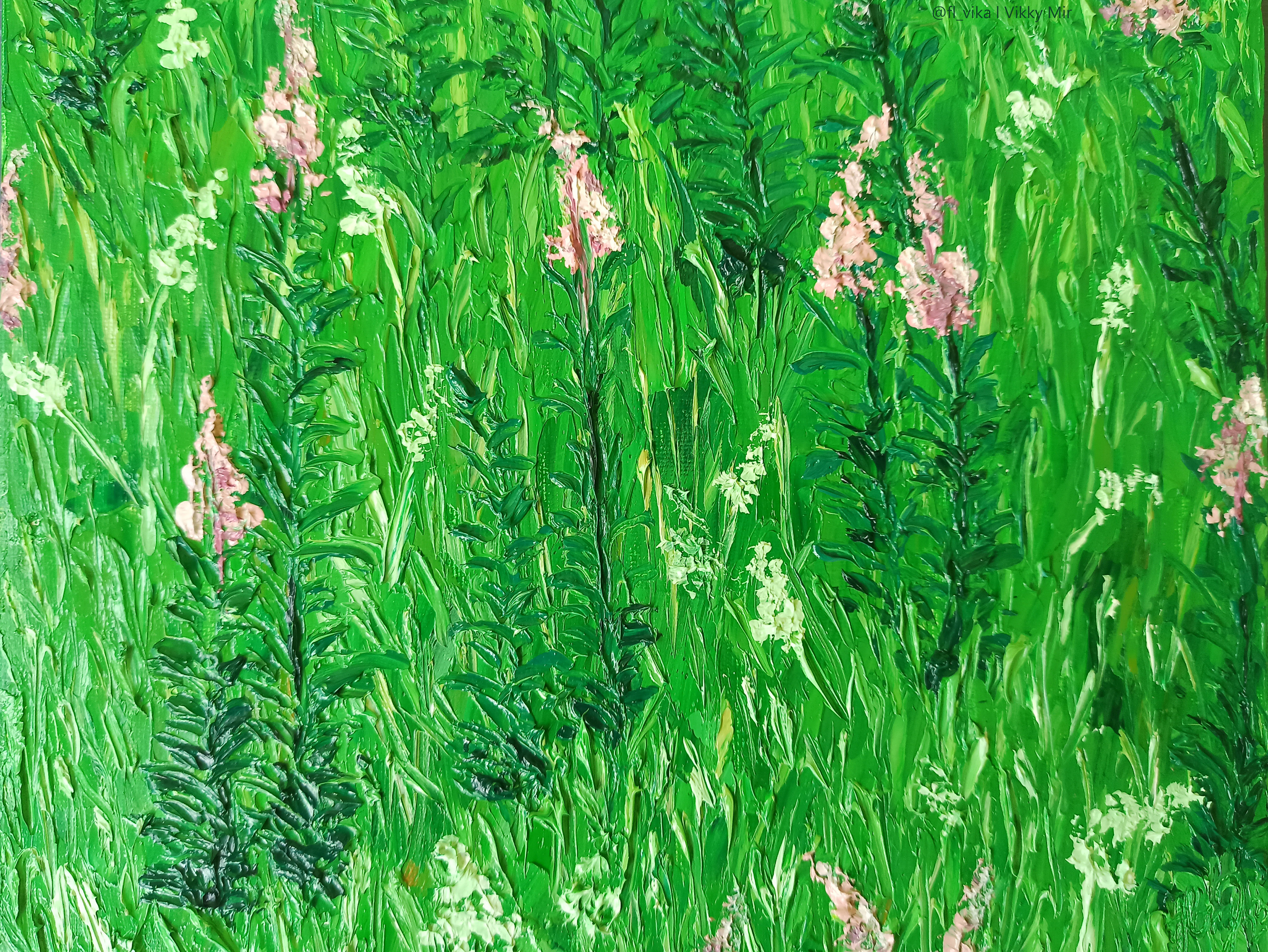 На картинах из цикла "Июньская зелень" художник Vikky Mir передает яркие и насыщенные цвета летней природы. Картина "Зелень. Иван-чай" не исключение. По композиции картина напоминает бесшовный узор из иван-чая. Это растение написано во время цветения, выполненный в пастозной манере, что придает ему объем и выразительность. Рельефными мазками художник передал текстуру листьев и цветков растения.